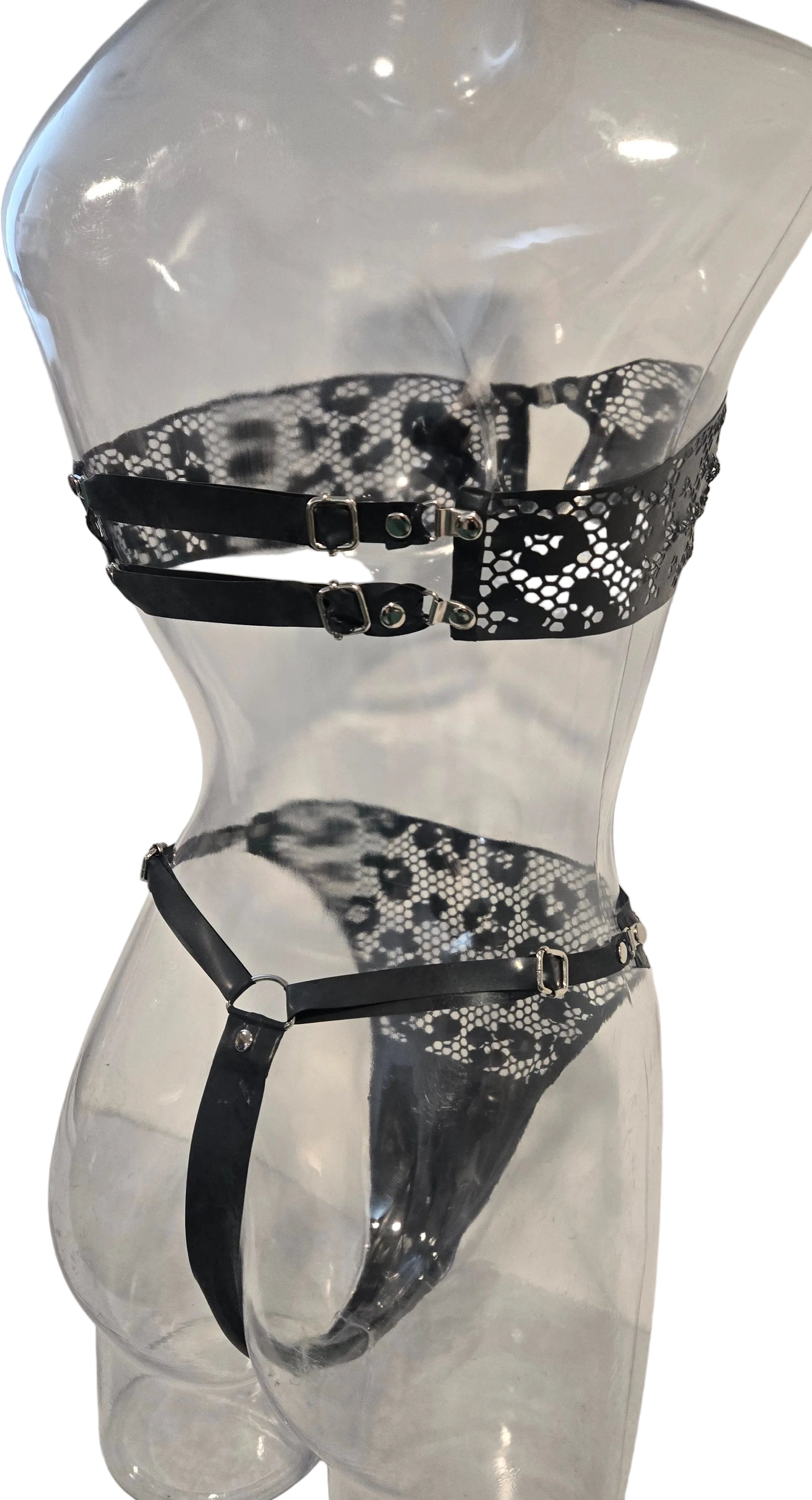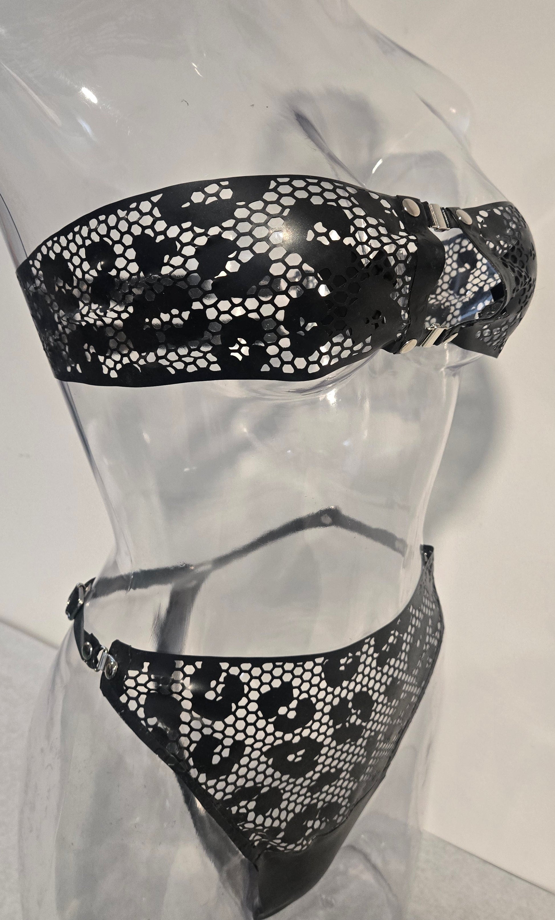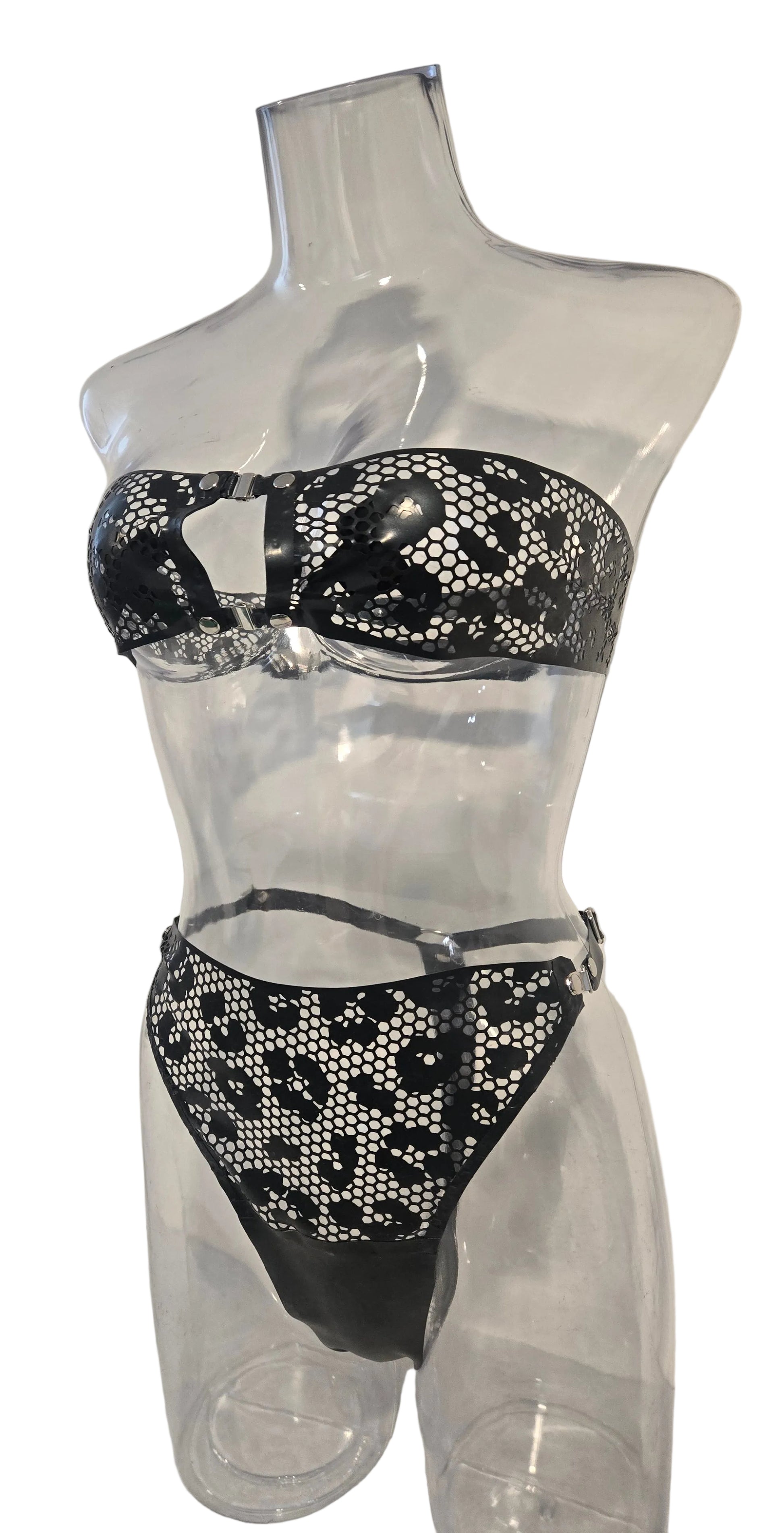 Embrace your wild side with the Kat Net Set! This stylish lingerie features a daring laser-cut latex leopard pattern, combining a thong and bandeau bra for a look that’s both fierce and flattering. Feel empowered and confident, ready to make a statement that leaves a lasting impression!