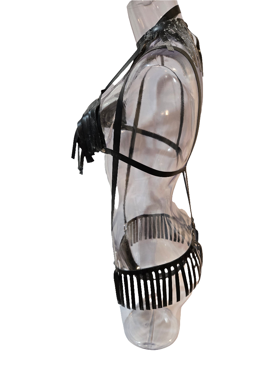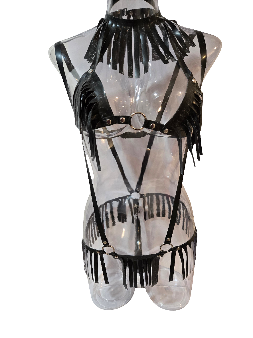 This Fringe Sling Shot Bikini Set is a must-have for anyone looking for a sexy and stylish swimwear option. The fringe detailing adds a flirty touch, while the slingshot style provides a flattering fit. Made with high-quality latex, it is perfect for lounging by the pool or making a statement on the beach, or night out!